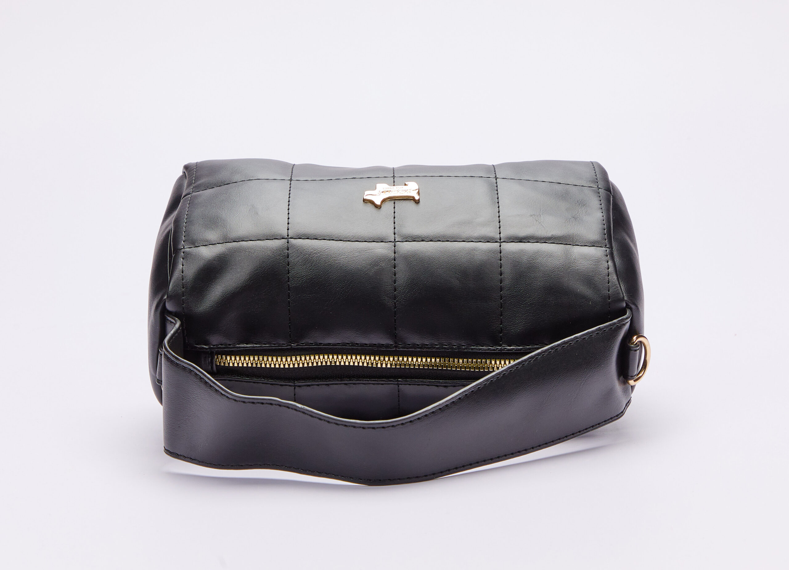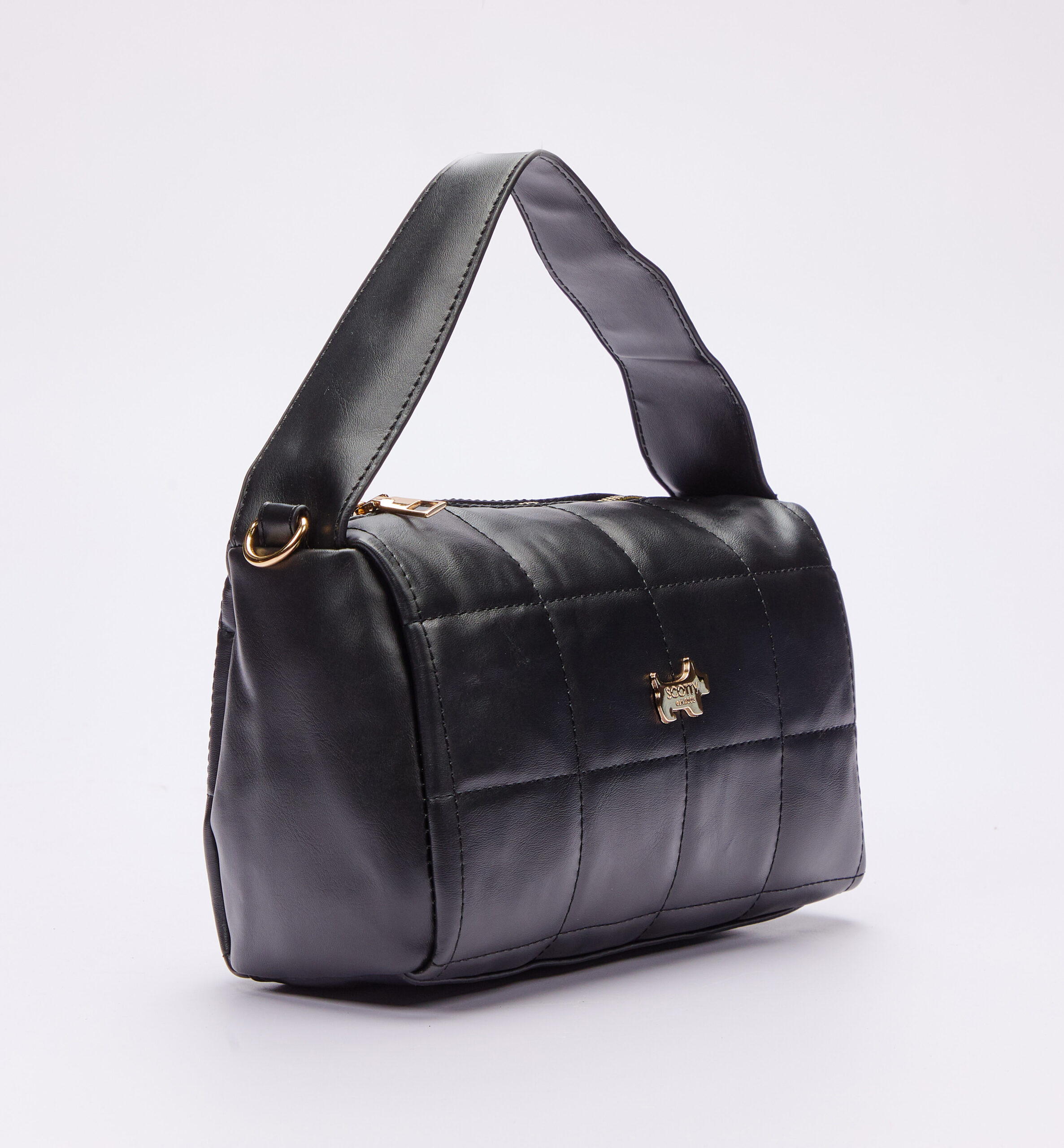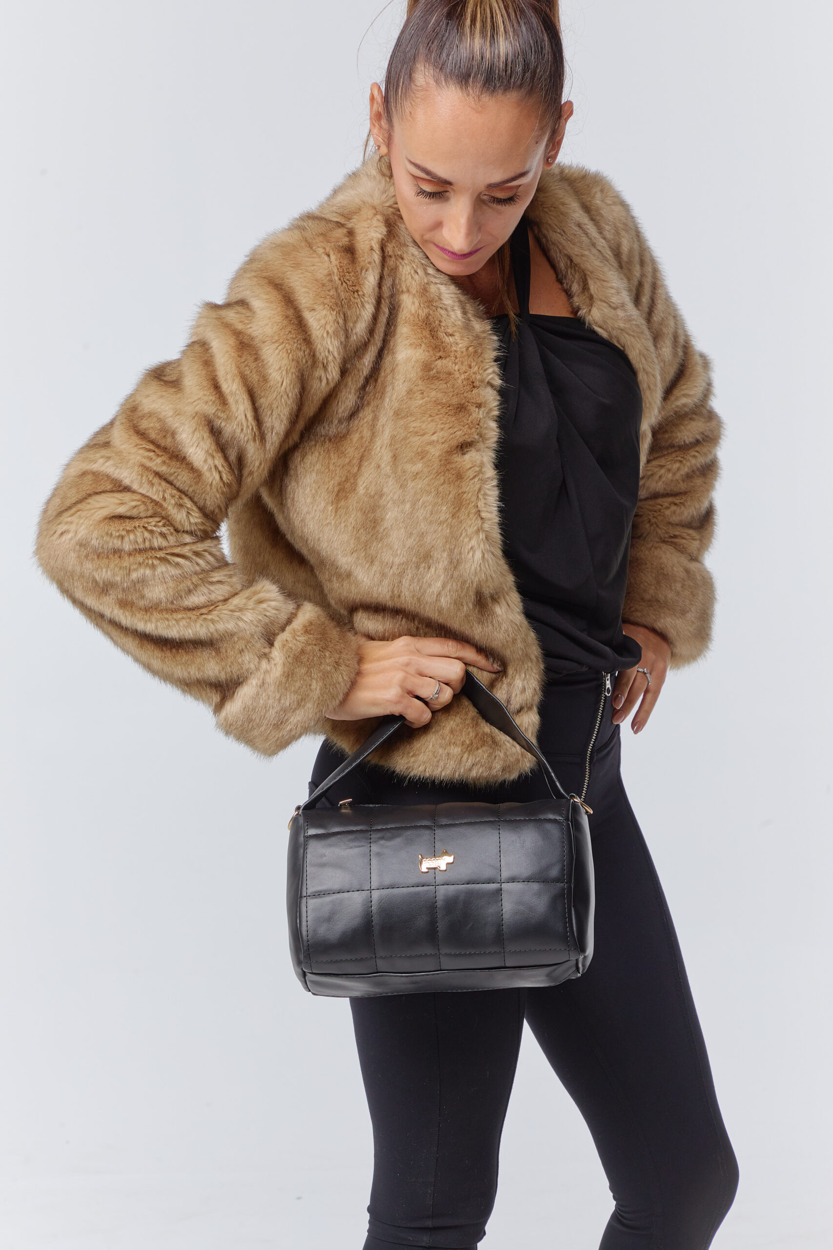 The Bella barrel handbag has a cylindrical shape, crafted from smooth vegan leather. It features a zippered top, sleek handles, and minimalistic hardware, combining style with practicality. The interior is lined with soft, luxurious fabric and includes a zippered pocket and open compartments for easy organization. Spacious yet refined. The bag also comes with a second adjustable strap included allowing the bag to be worn as a crossbody.