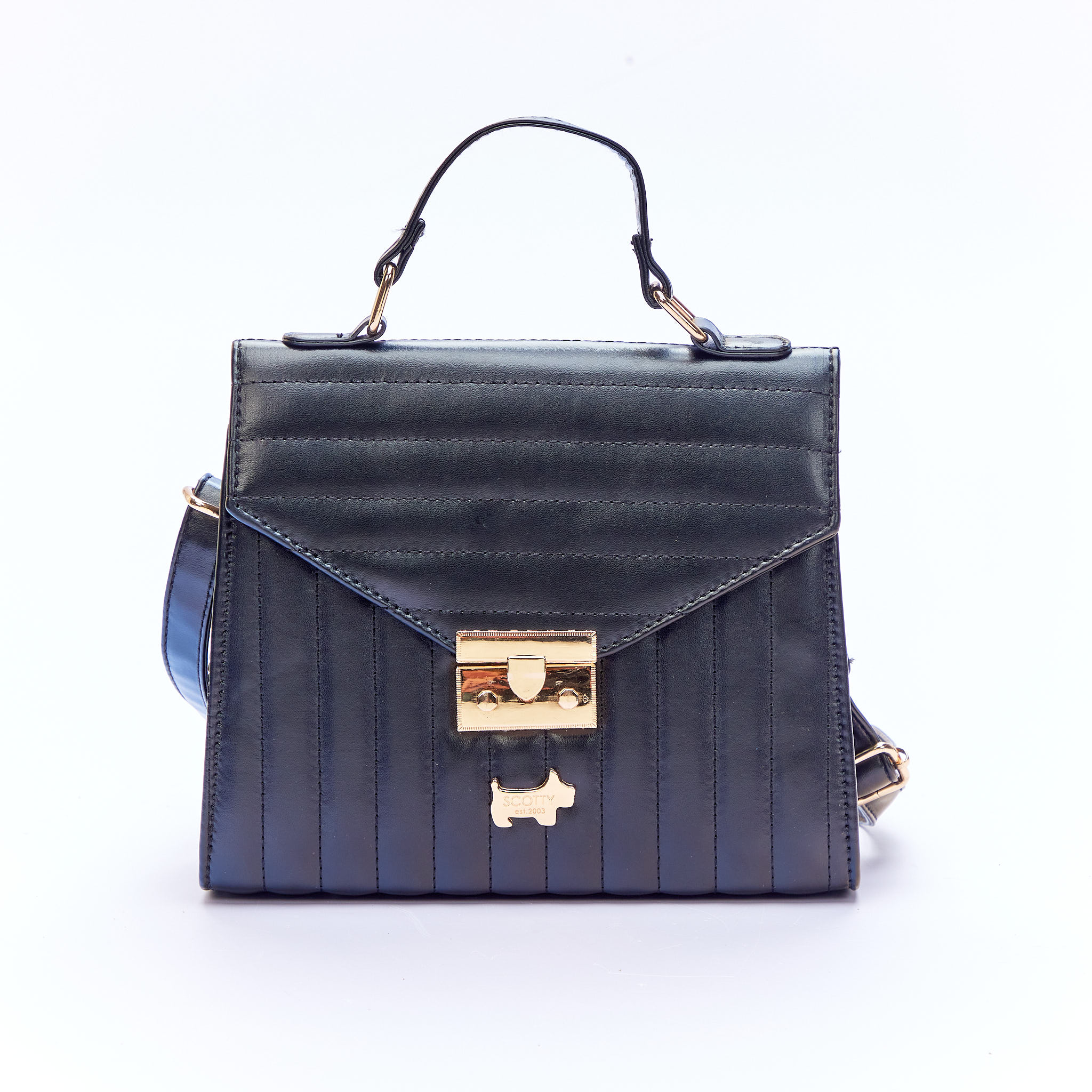 Beautiful medium sized satchel bag with soft textured chevron stitched vegan leather. The bag has a front opening flap which is secured by a double button press clasp. Under the flap there is a top opening zipper which opens a generous internal compartment with internal zippers and folders. The bag can be worn as a clutch or use the long adjustable strap and use it as a crossbody bag. A Great Scotty!