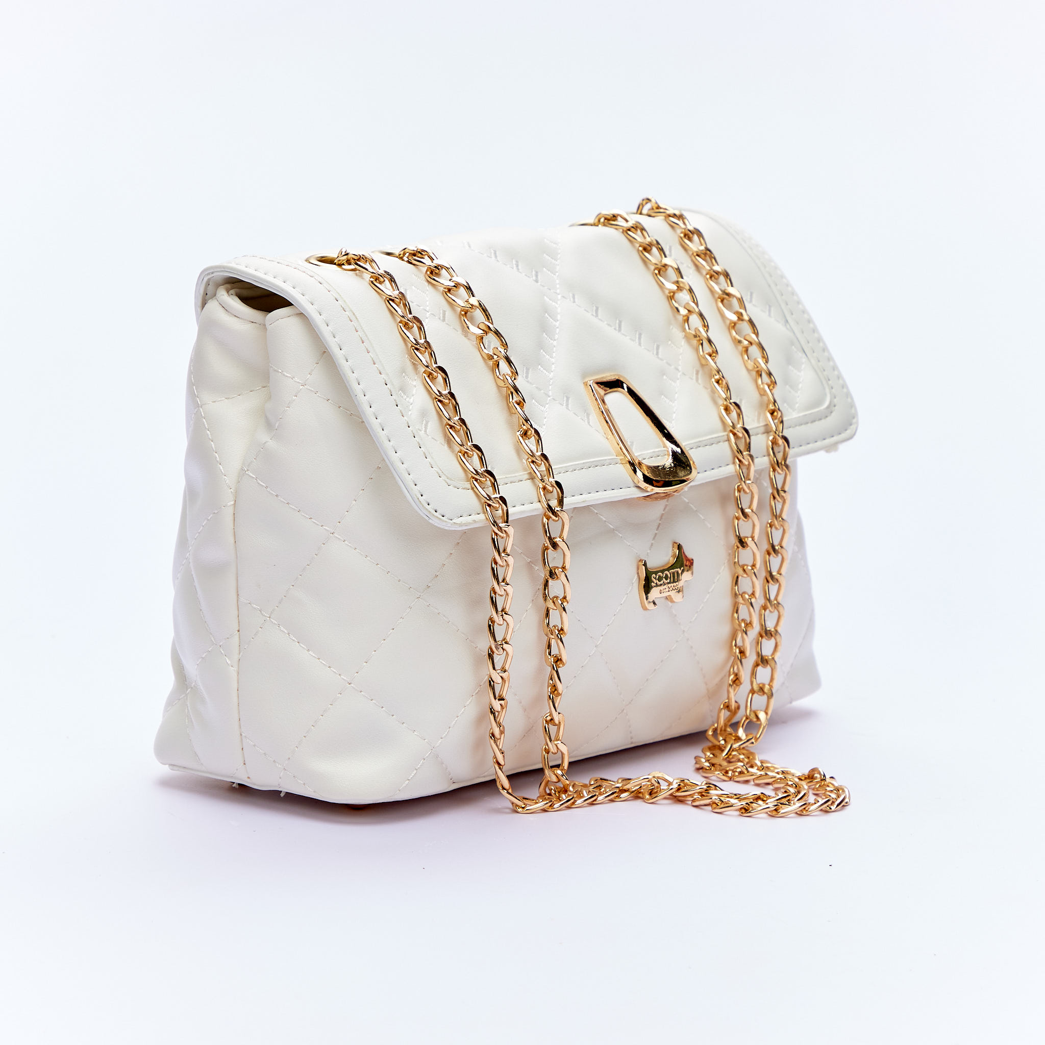Beautiful medium sized satchel bag with soft textured Diamond stitched vegan leather. The bag has a front opening flap which is secured by a single button magnetic press clasp. Under the flap there is a top opening zipper which opens a generous internal compartment with internal zippers and folders. The bag can be worn as a clutch or use the long adjustable strap and use it as a crossbody bag. A Great Scotty!