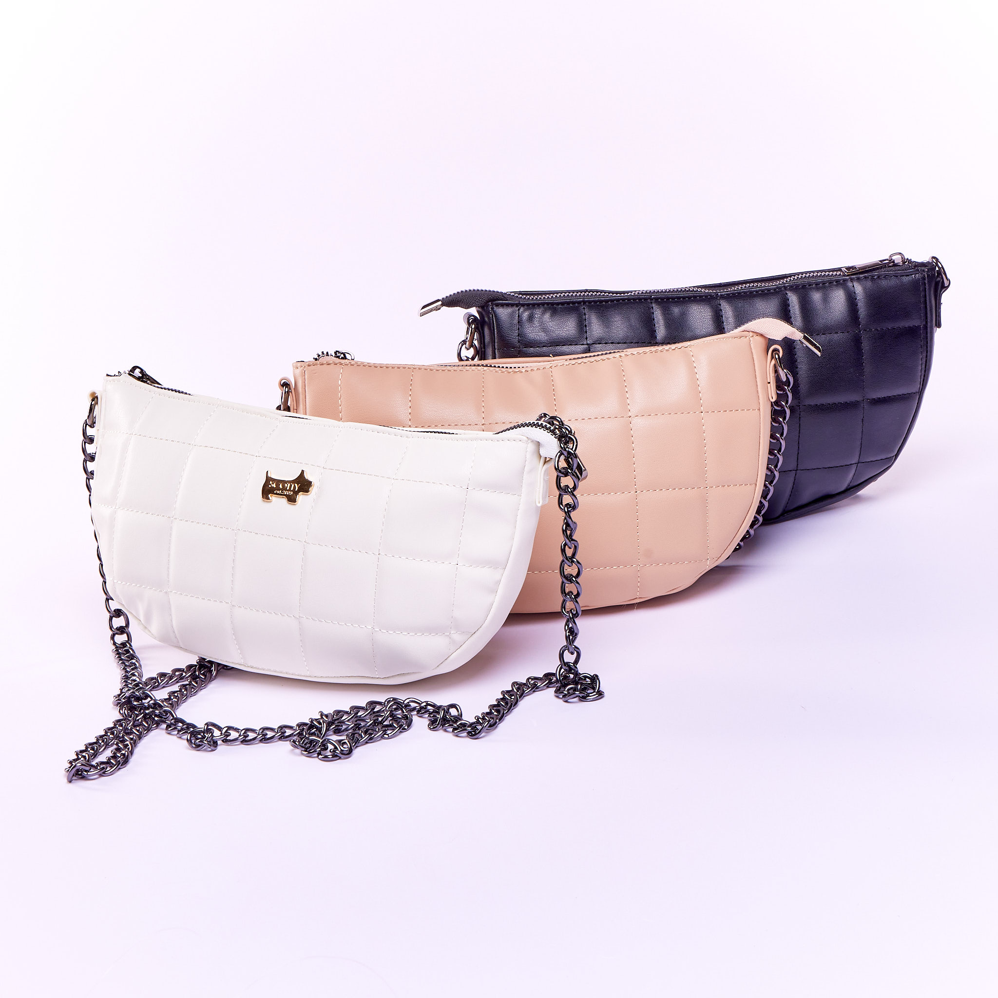 Beautiful soft padded bowler bag. The bag can be worn two ways, as a bowler or connect the chain strap and wear it as a crossbody. Strong top opening zipper leads to a large internal compartment with internal zippers.