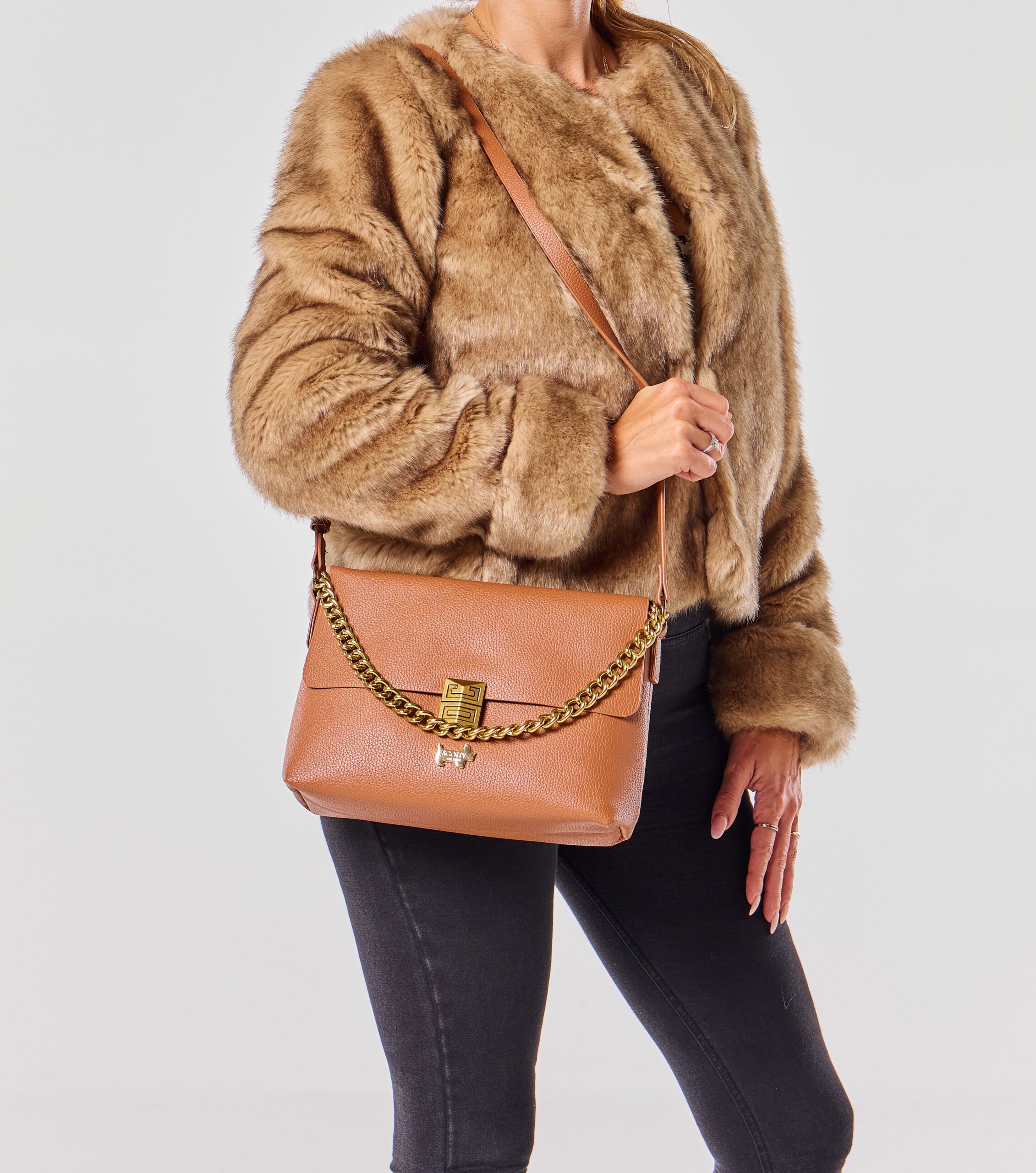 An Italian-inspired elegant crossbody handbag crafted from premium vegan leather. Featuring a chic gold chain detail, finest hardware, and a top zipper opening to a spacious interior with secure compartments. The long adjustable strap is removable, allowing the bag to transform into a sophisticated clutch.